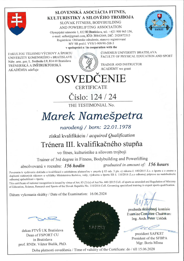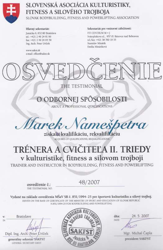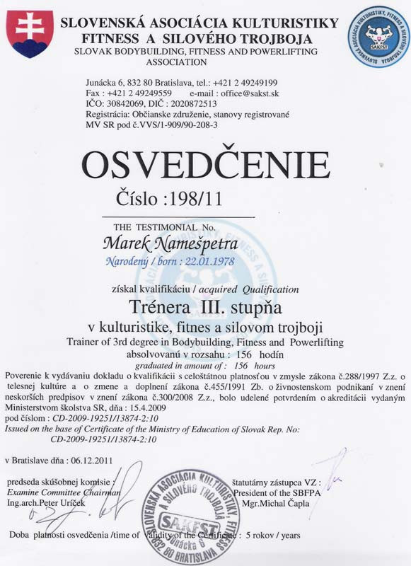 Certifikát: Certifikát trénera II. triedy (Vydal a udelil: SAFKST) a Certifikát trénera III. pre kulturistiku, fitness a silový trojboj (Vydal a udelil: SAKFST v spolupráci s FTVŠ Univerzity Komenského v Bratislave)